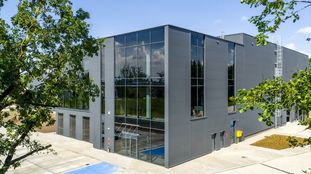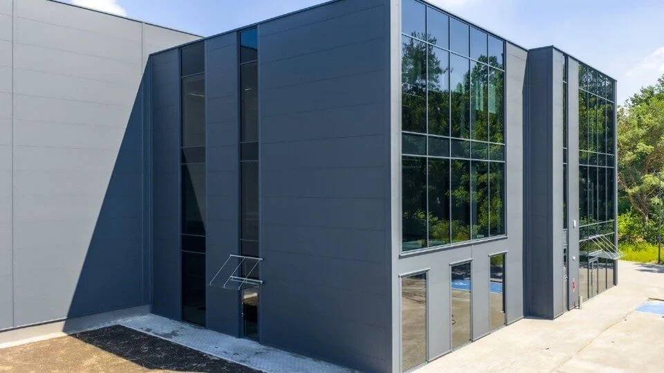 Die Fassade des Gebäudes wurde mit ARPANEL‑Sandwichpaneelen in der Farbe RAL 7016 MAT ausgeführt, was dem Objekt ein modernes und ausdrucksstarkes Erscheinungsbild verleiht und sich perfekt in aktuelle architektonische Trends einfügt.